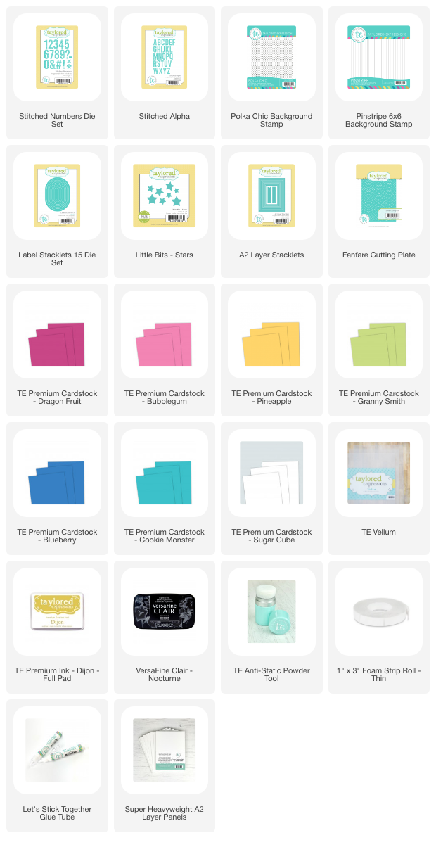 Previously release products already in the TE Catalog: Little Bits – Stars, Fanfare Cutting Plate and A2 Layer Stacklets. Such fun! I need a few of these to send out. Bwaaaaahaahaa! Love that the numbers now exist, as this is one of my favorite die sets!